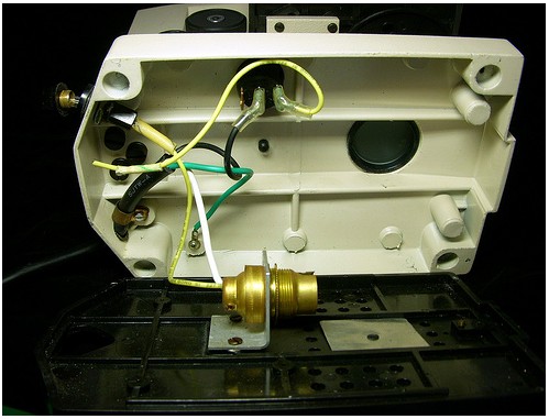 下面這臺(tái)顯微鏡同時(shí)出現(xiàn)上面說的三種問題,燈不見了、線斷掉、保險(xiǎn)絲也壞掉。這樣燈會(huì)亮才怪。所以要修這種情形,還得準(zhǔn)備銲槍才行。