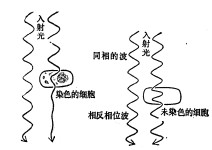 光的相位發生變化,通過細胞厚而致密的部位(如核)時光速變慢,與通過鄰近薄的部位